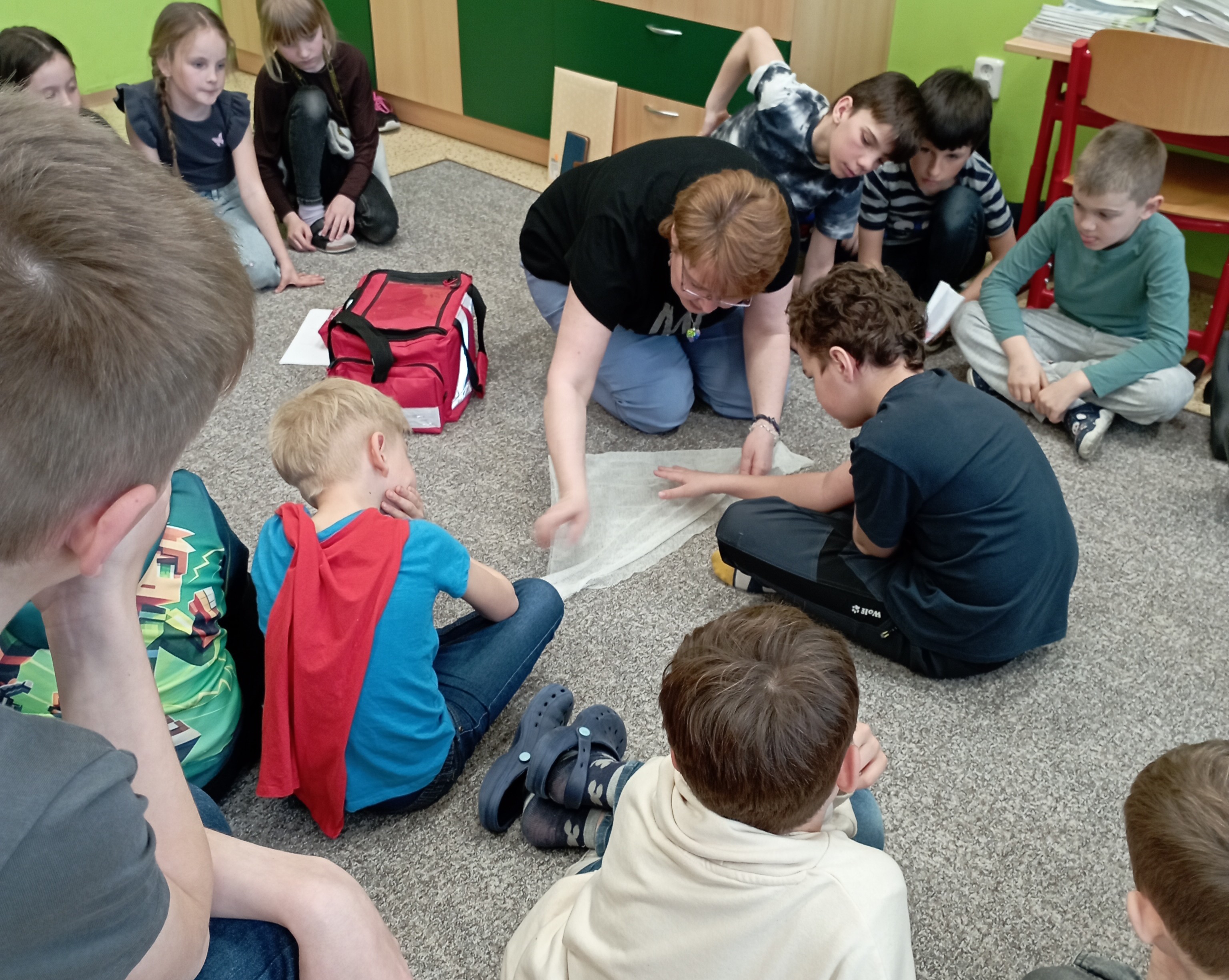 Družinové děti se odpolko seznámily se základy První pomoci. V rámci interaktivní besedy s paní asistentkou Evou Brátovou si vyzkoušely ošetření kamarádů.