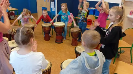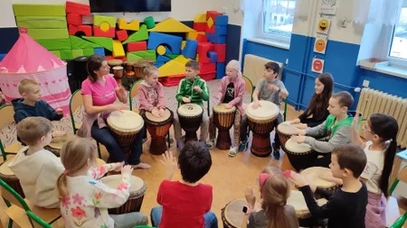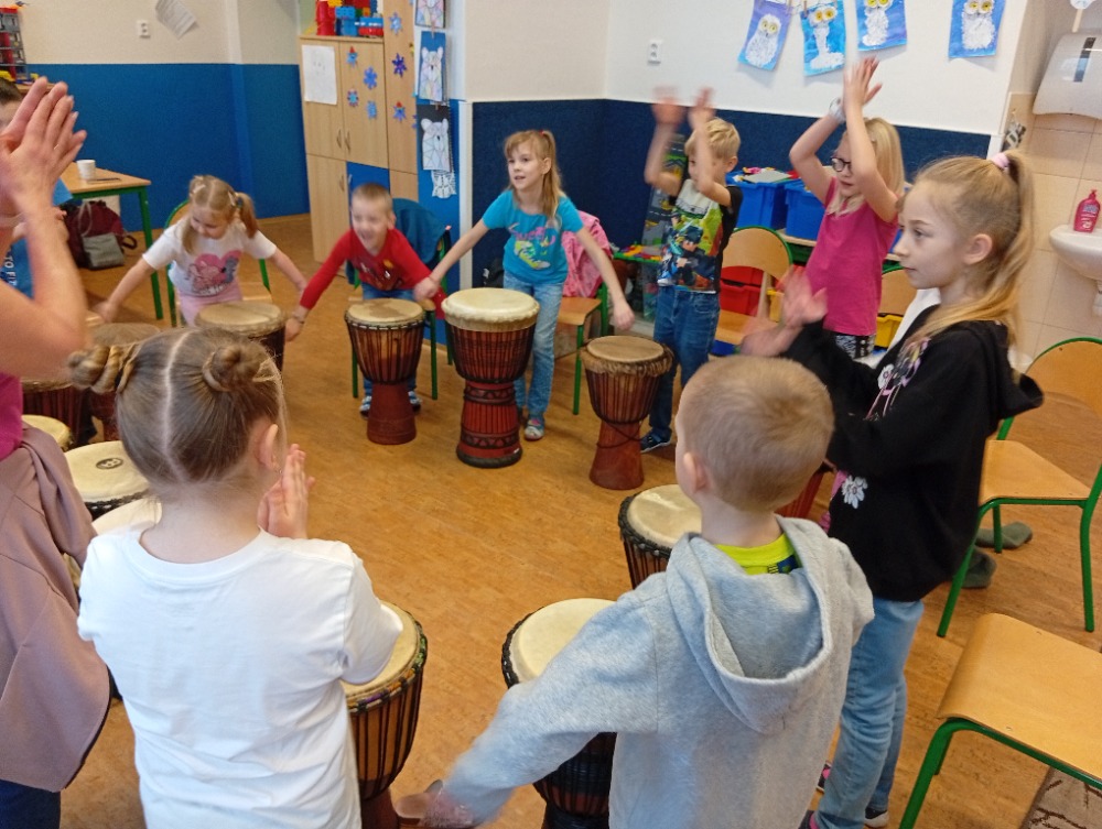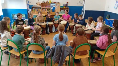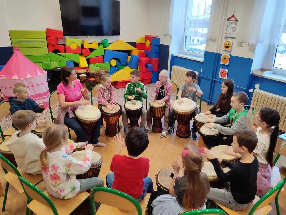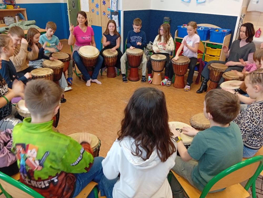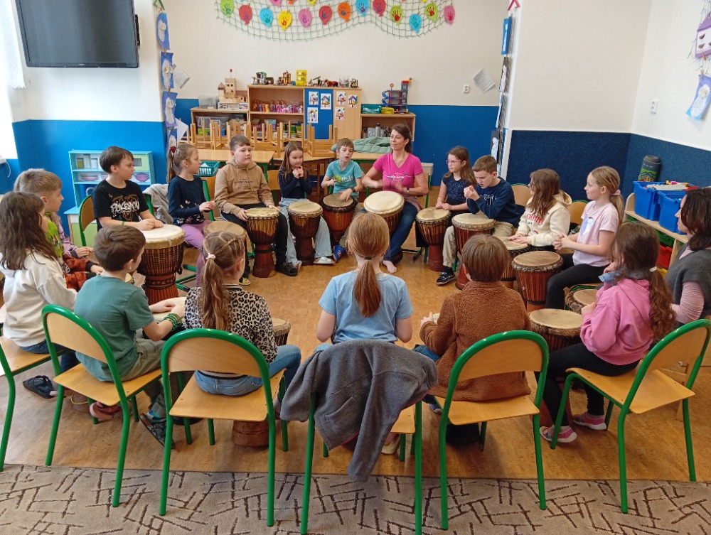 V pondělí 9.2. si žáci první, druhé a třetí třídy v Horňáku užili hraní na DJEMBE - africké bubny. U nás ve škole si skupinové bubnování pro naše hornokostelecké žáky připravila paní učitelka hudební výchovy ze 2.stupně Jana Kovalová. Přichystala si hodinová sezení pro jednotlivé třídy. Nejdříve dětem řekla pár slov o těchto nástrojích – bubnech DJEMBE.