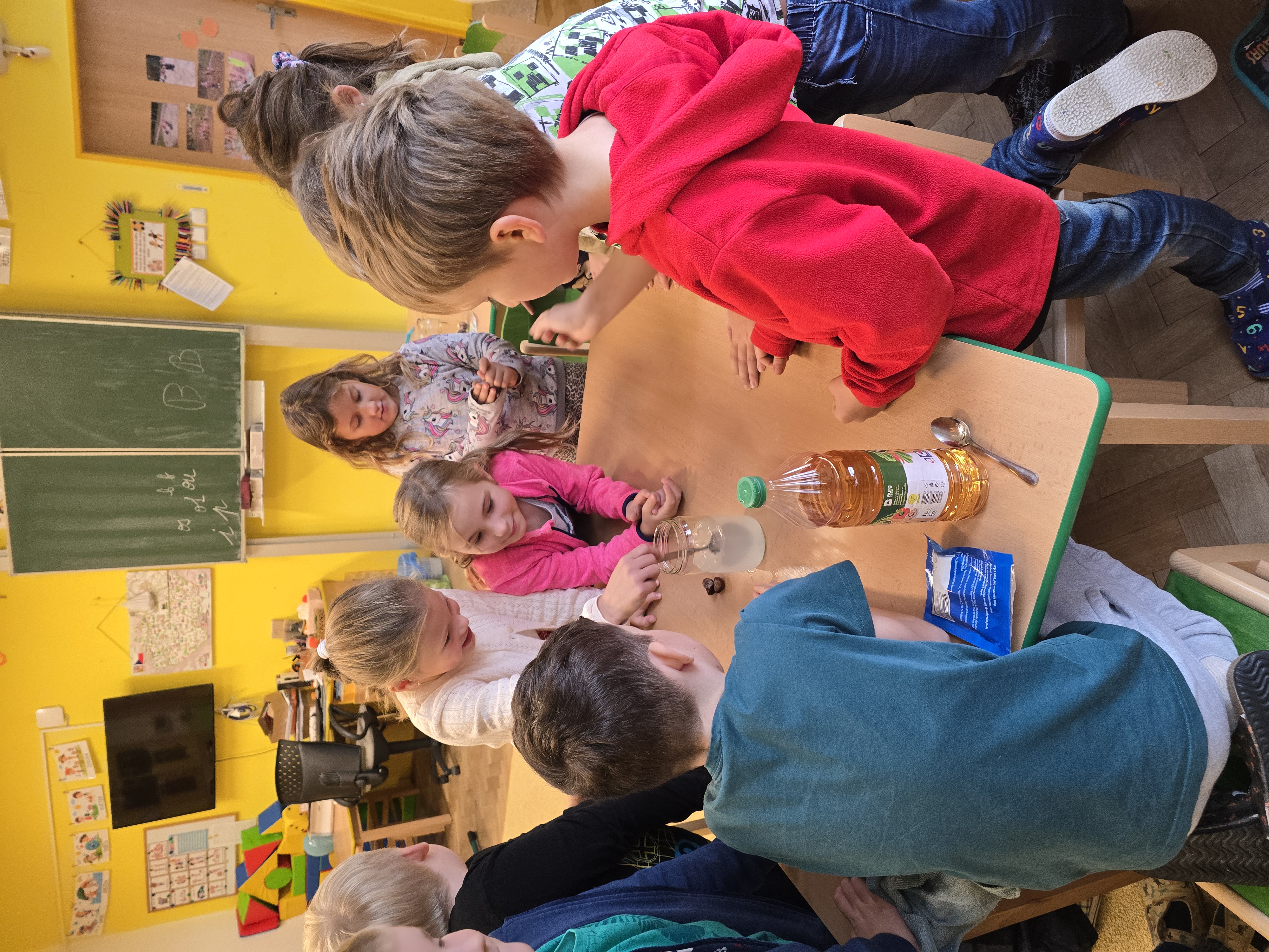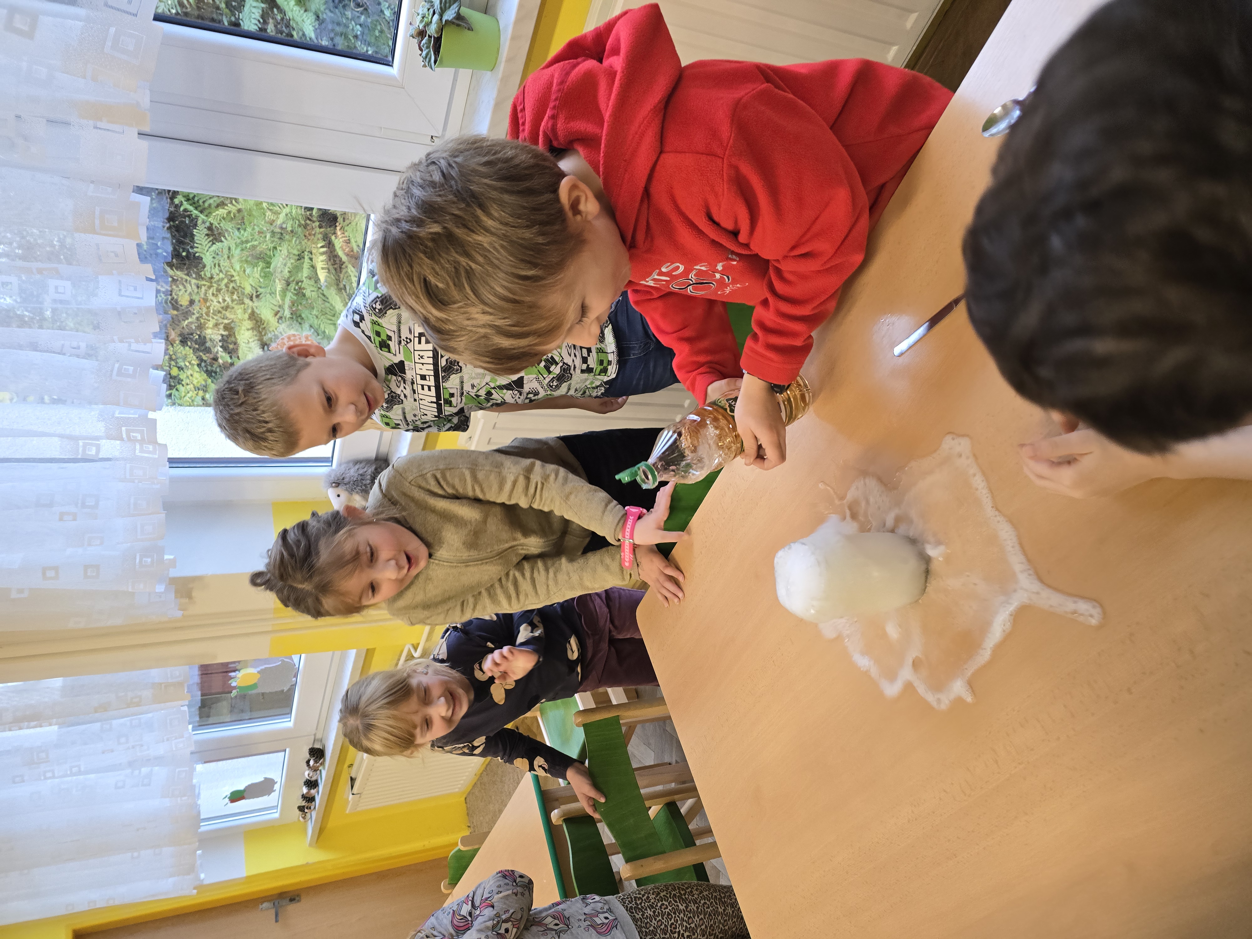 Vzniklo bublání, syčení i malá ,,erupce“ a spousta otázek o tom, jak to vlastně funguje. Byla to skvělá příležitost poznat, jak probíhají reakce, pozorovat změny. Děti si vyzkoušely roli malých badatelů a s nadšením pozorovaly, jak „věda ožívá“ v praxi. ![]()