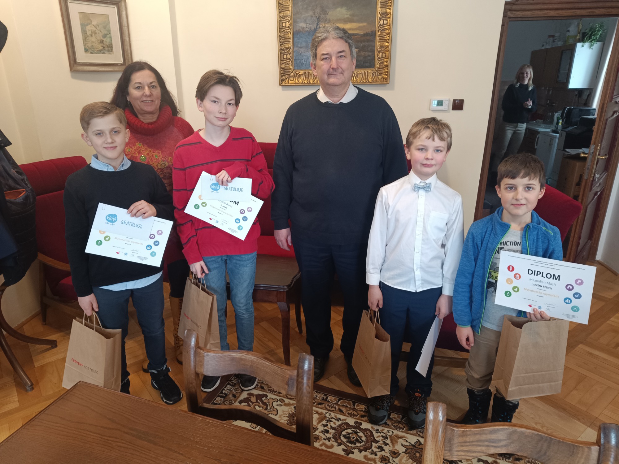 Vyzdvihujeme skvělé výkony chlapců z našich pátých tříd, kteří se šk. roce 2024/2025 zúčastnili okresního kola Matematické olympiády v Náchodě. Naši mladí matematici si vedli výborně a obsadili první tři místa! 1. místo – K. Bureš; 2. místo – J. Špelda; 3. místo – J. Regner. Výborného výsledku dosáhl také M. Mach, který obsadil krásné dělené 5.–6. místo. Ti všichni jsou úspěšnými řešiteli. Za zmínku stojí i skvělé umístění M. Hejny (8. místo) a Š. Kaulicha (10. místo). Tento velký úspěch našich žáků podtrhl i slavnostní moment, kdy jim diplomy osobně předal starosta Červeného Kostelce, pan Tomáš Prouza.